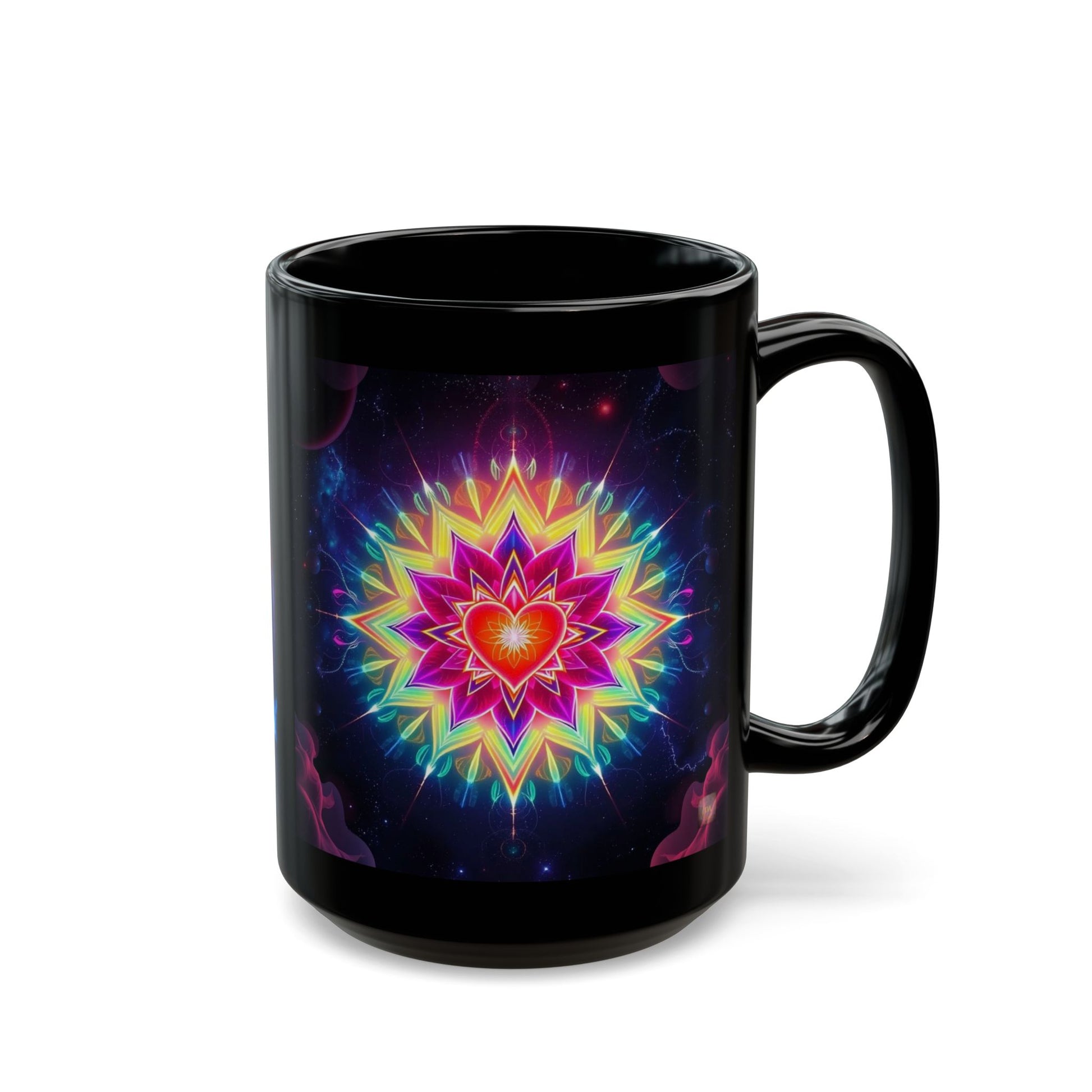 Black Ceramic Mug 15 oz— Vibrant Sacred Heart Sacred Geometry Light Body Merkaba Coffee Cup by Divine Arts