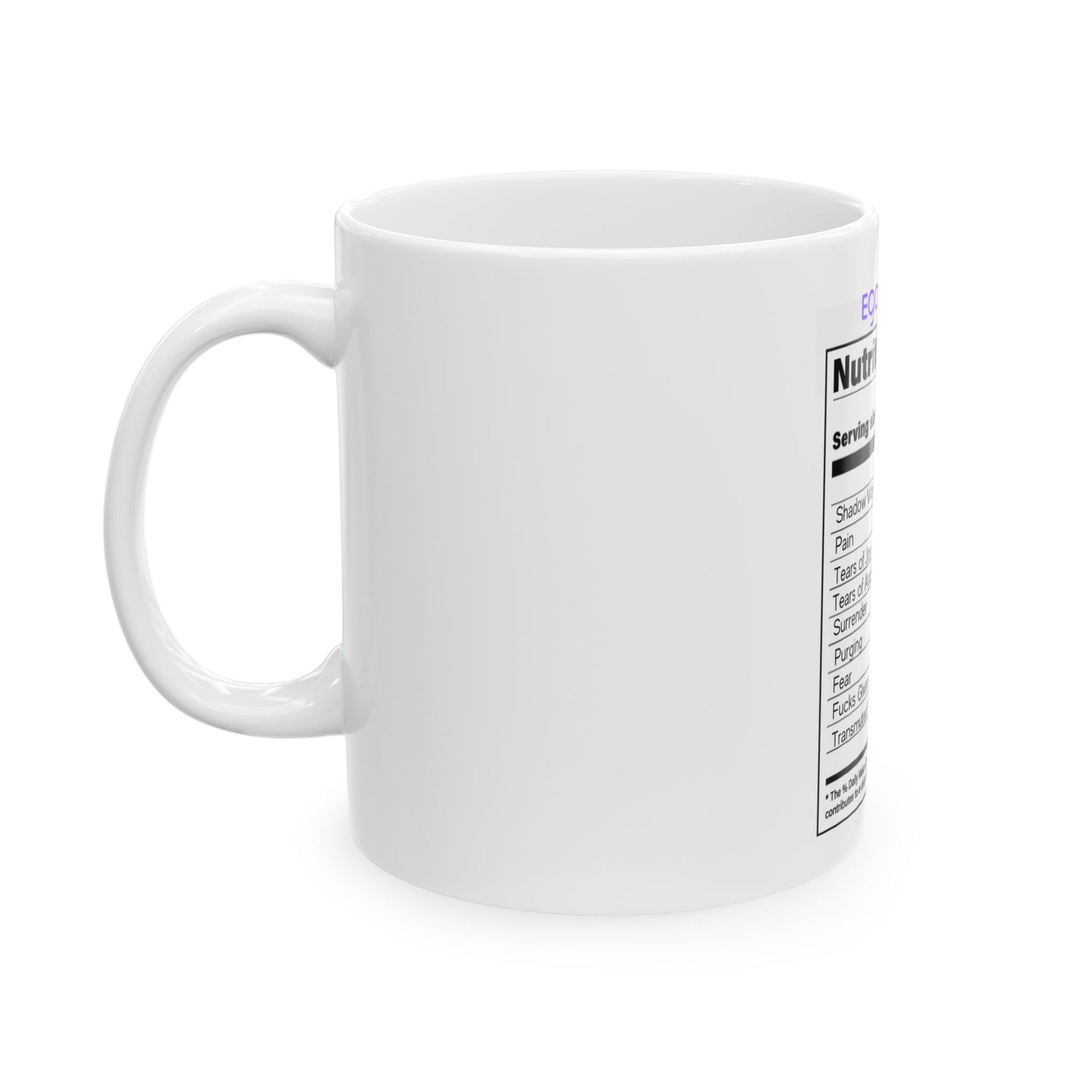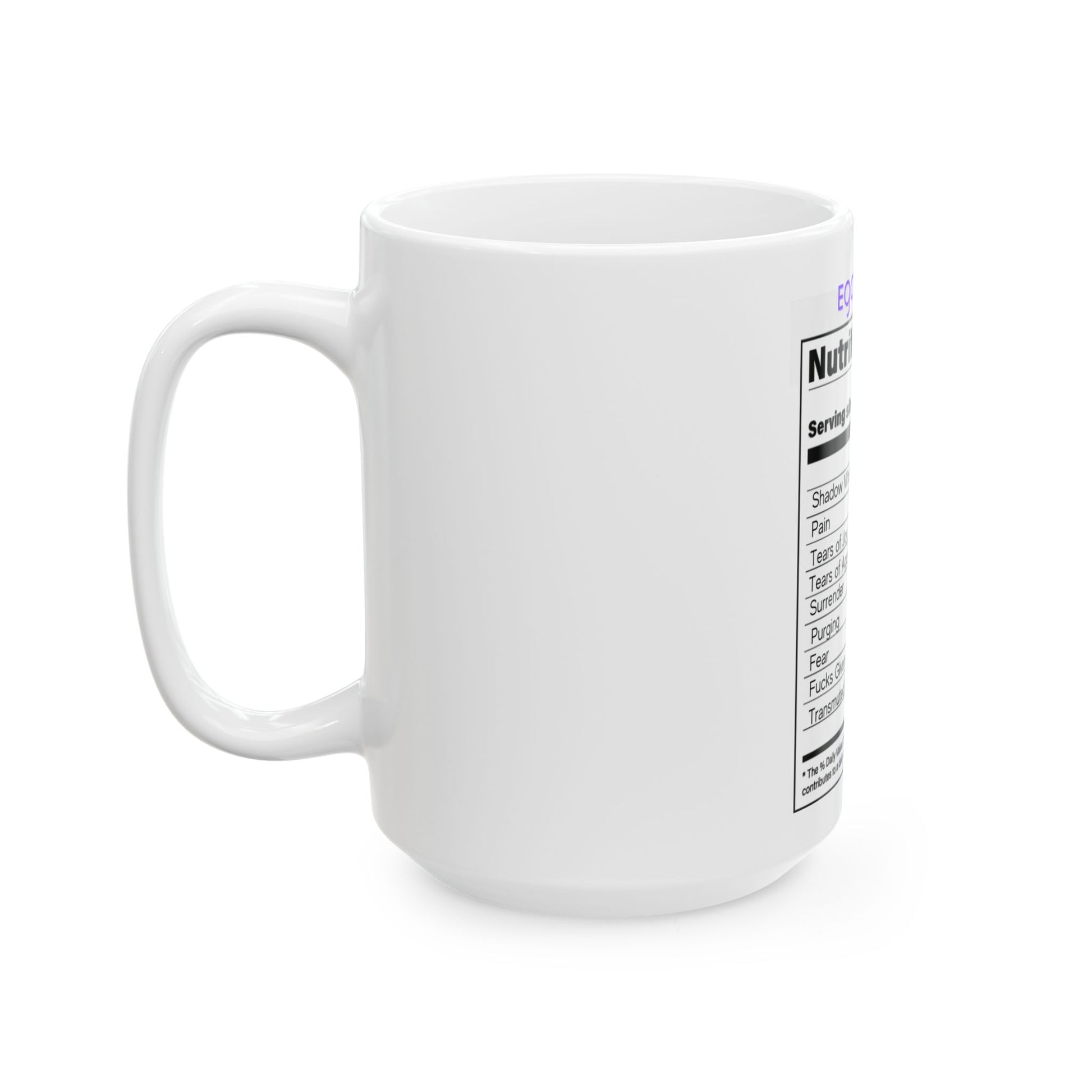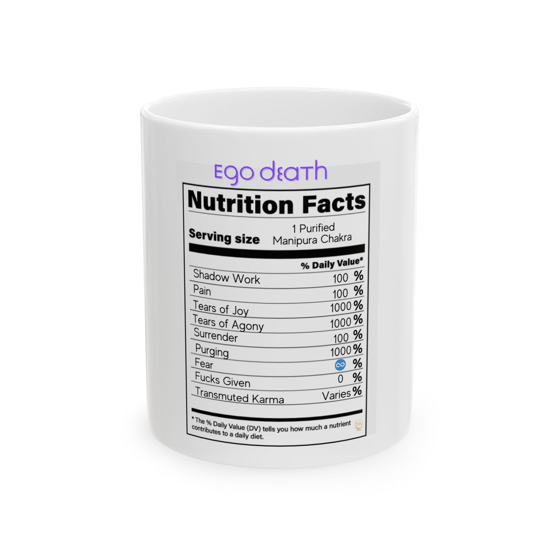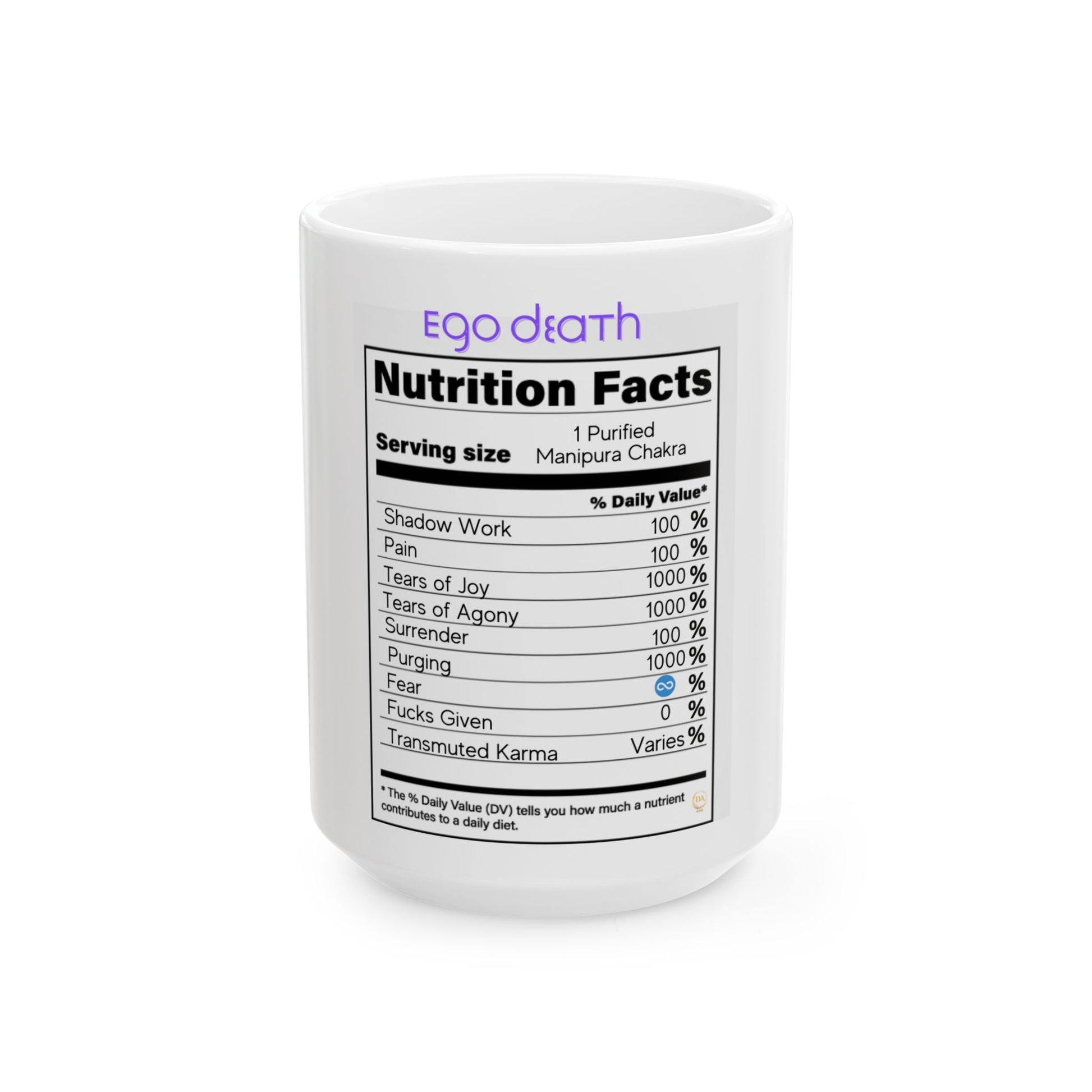 Ceramic Spiritual Humor Mug, (11oz, 15 oz), Ego Death Nutrition Facts Spiritual Mug, Gift for Him or Her, Unique Boutique Hokiday Christams Birthday Spiritual Gift, 5D Earth Ascension Art by Divine Arts