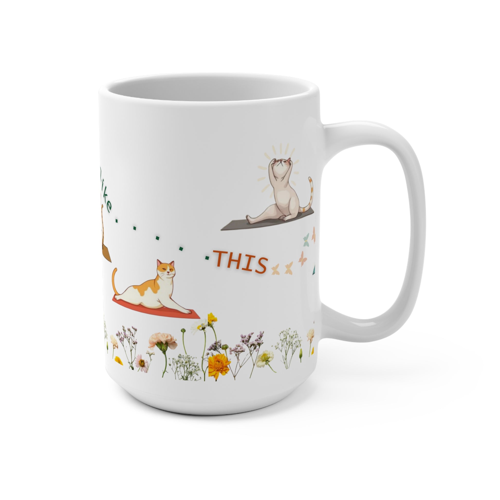 Warm morning light, a quiet kitchen counter, and a slow breath before the day begins. This 15oz ceramic mug brings that gentle pause into everyday life. Cartoon sketches of cats in calisthenic yoga poses and stretches with soft curvy lettering curl along through the mug, sitting above a row of colorful wildflowers — it reads like a calm note to yourself reminding you to take time to relax, breathe & start the day with movement in meditation and flow. The rounded silhouette and C-handle feel familiar in hand, generous enough for long pours of coffee, tea, or cozy cocoa. Dishwasher- and microwave-safe, it moves from morning ritual to midday refill without fuss. Lead- and BPA-free, it’s made to be used and loved daily, a simple companion for slow starts, backyard mornings, and weekend lingering.