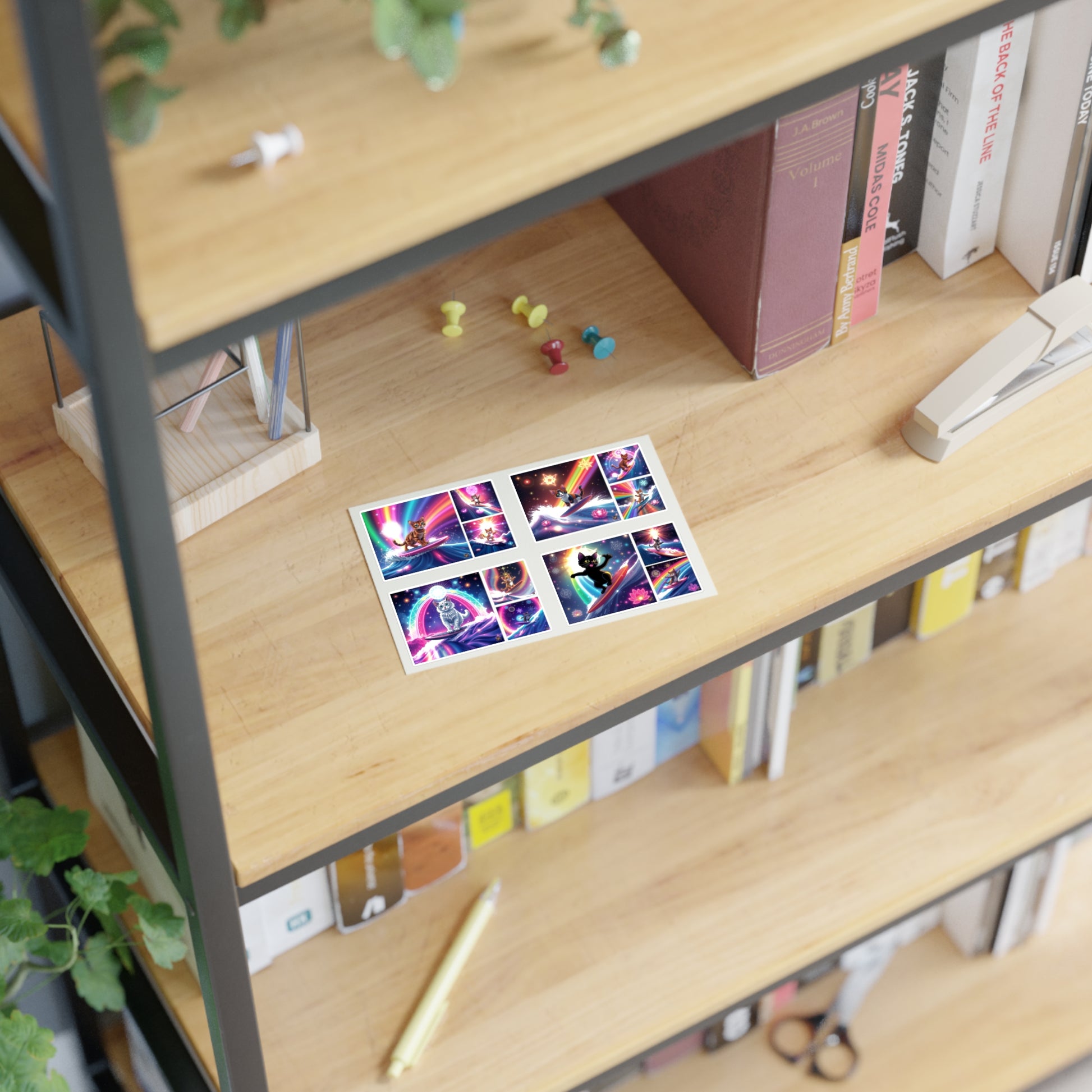 Bright, playful sticker sheets that bring a little magic to notebooks, laptops, and craft projects. Each sheet features vibrant, cosmic-cat artwork riding rainbow surf trails through starry sacred geometry lotus light jewelry lit skies โ colors that pop and details that catch the eye.