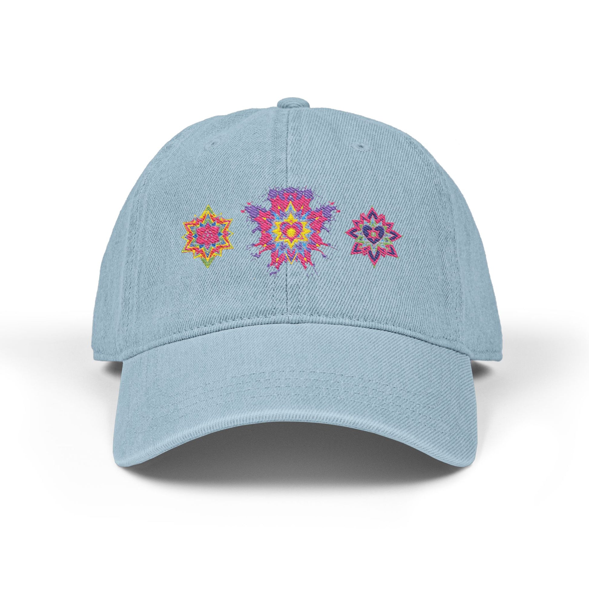 Denim Cap (Embroidery), 100% Cotton, Three Unique Embroidery Merkabas, Neon Galaxy Starry Light, Lotus Jewel Design by Divine Arts