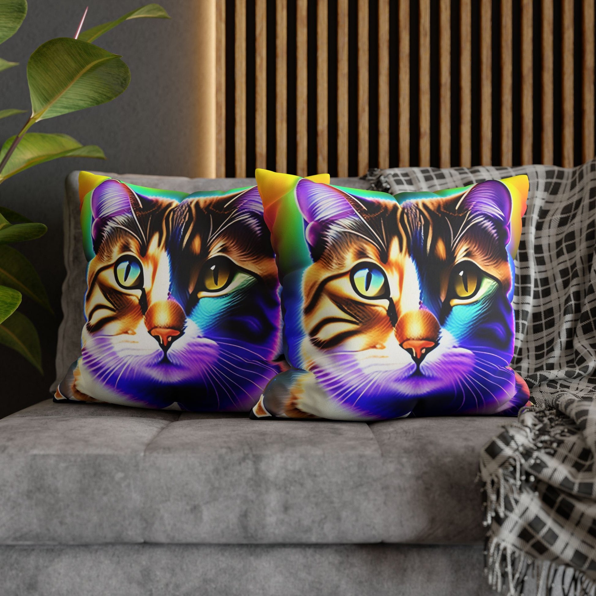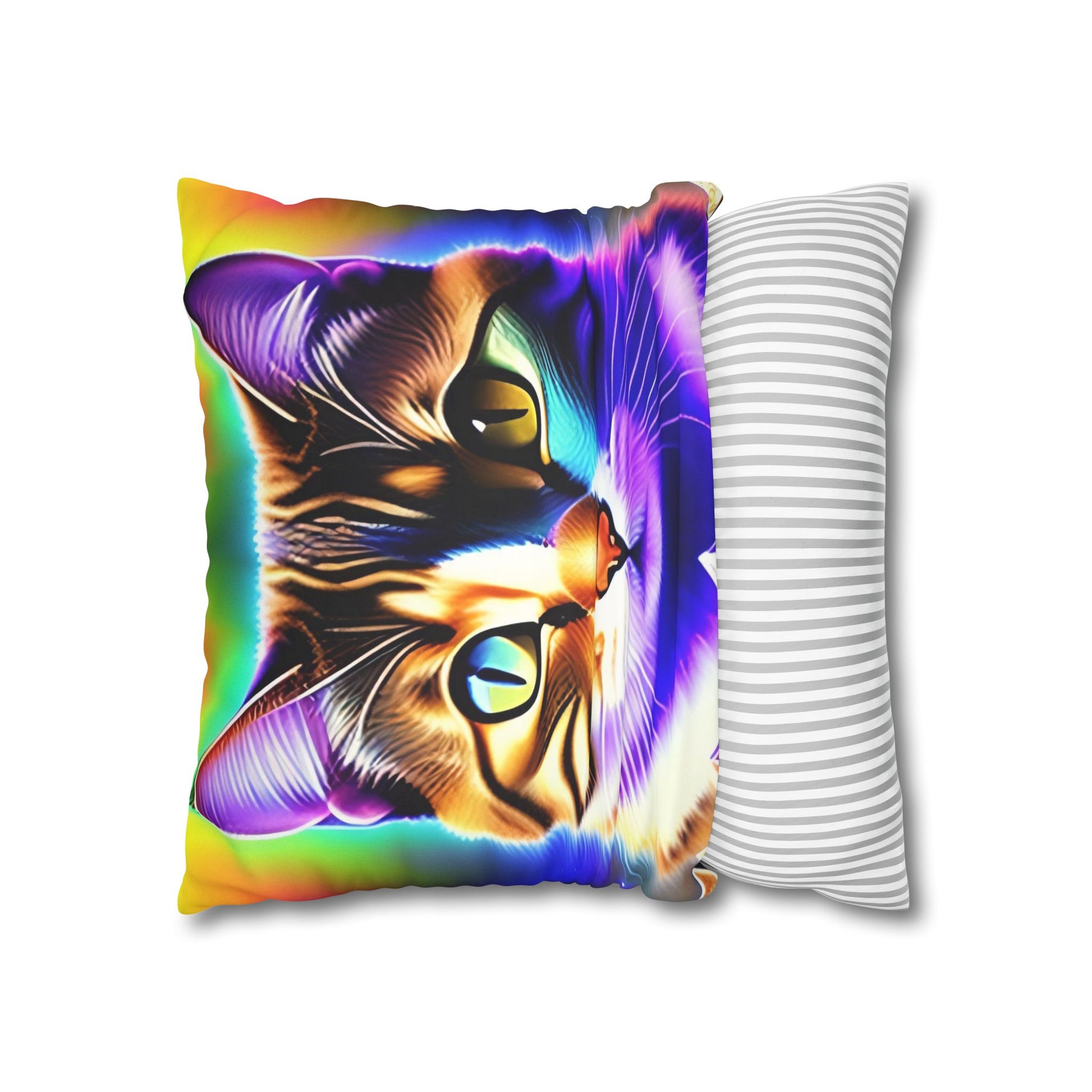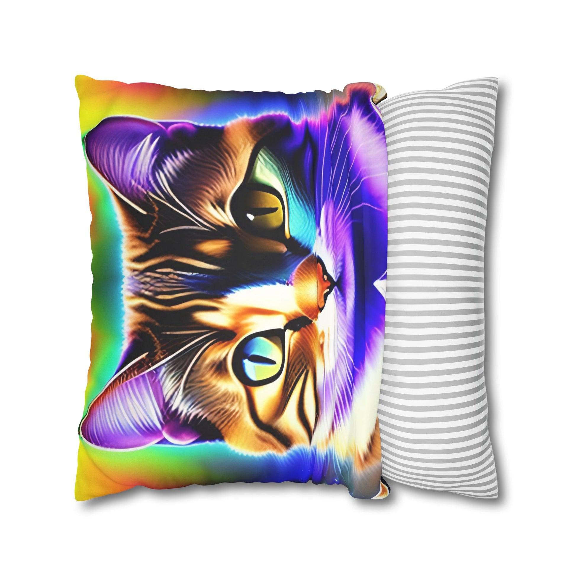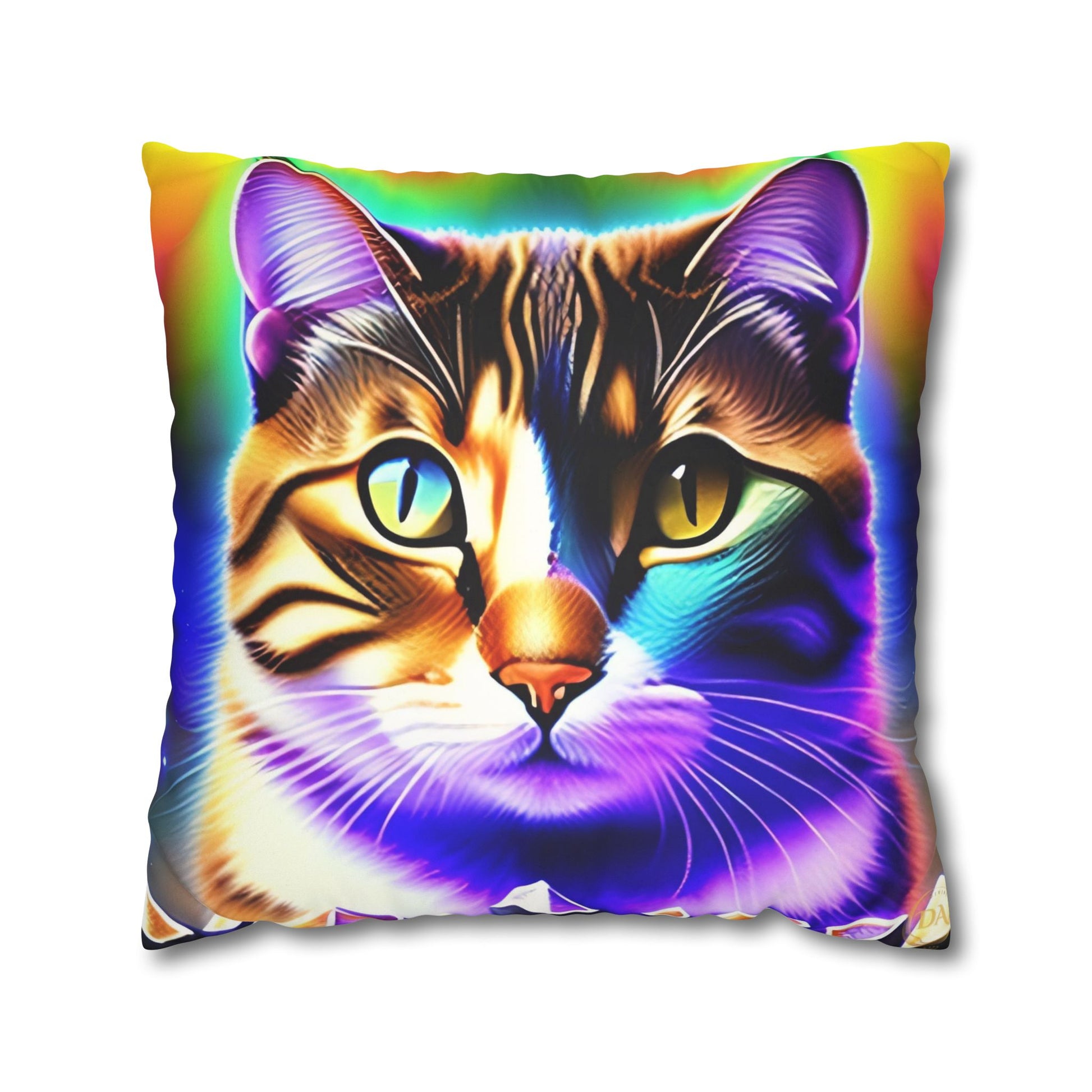 A definite statement piece, this indoor, 100% faux suede, double-sided print pillow cover is avaliable in various sizes and features a colorfully vivid spiritual portrait of a brown tabby cat with heterochromiia (i.e. one yellow-blue and one brown eye) immersed in rainbow light during meditation on the merkaba, the light body link to Earth's energy and sentient life shields.