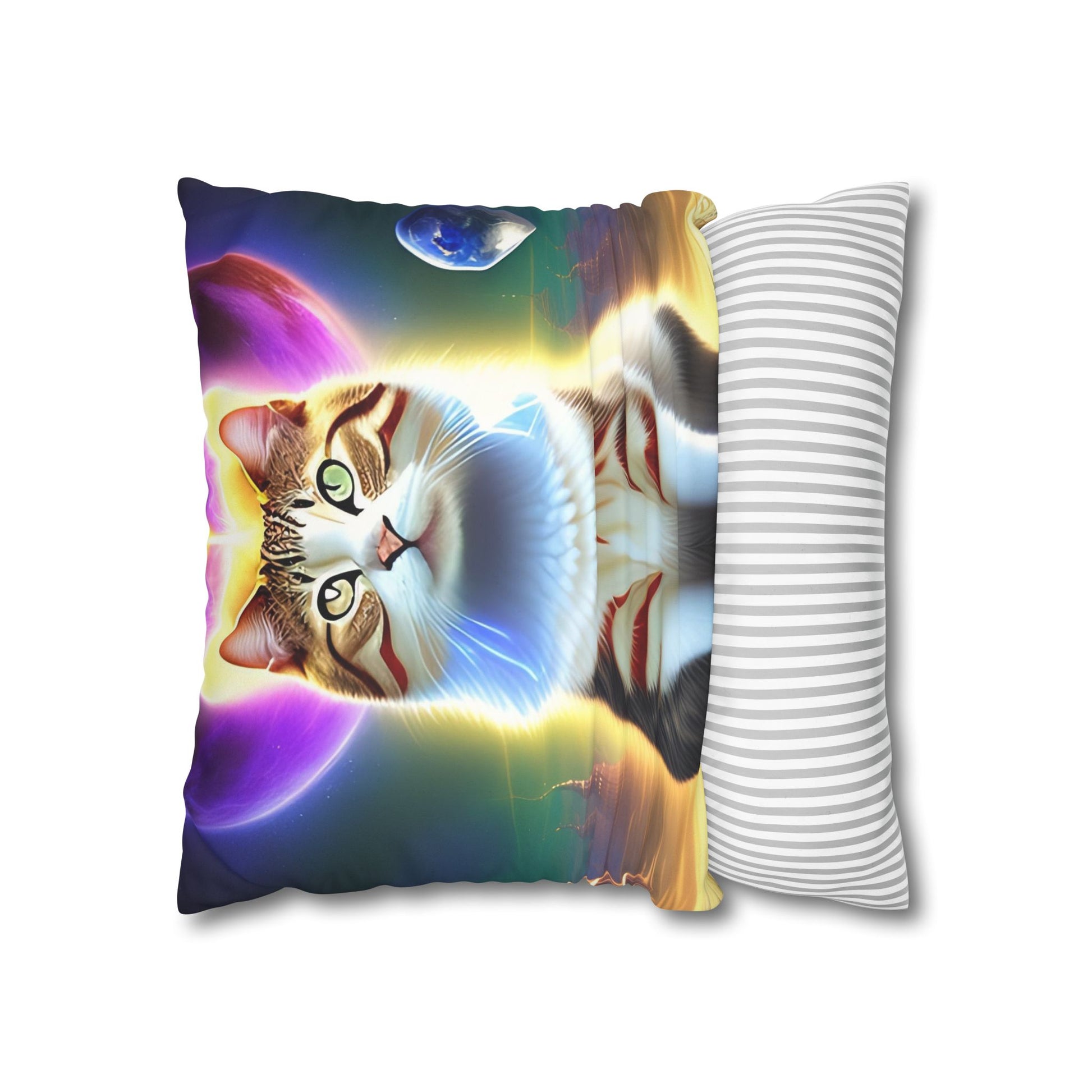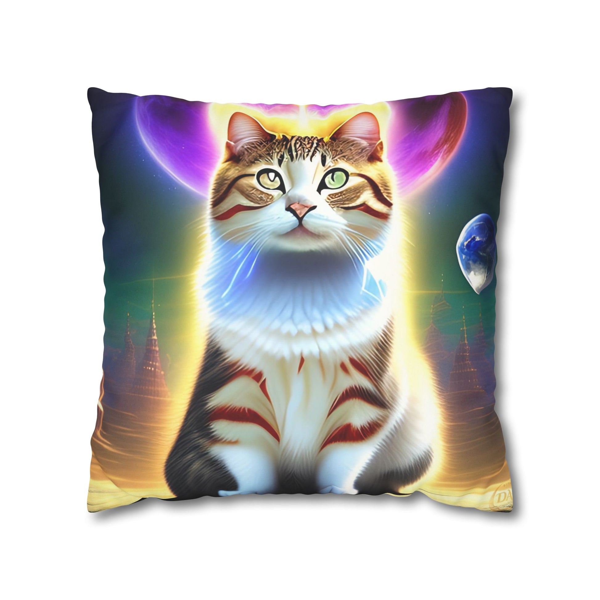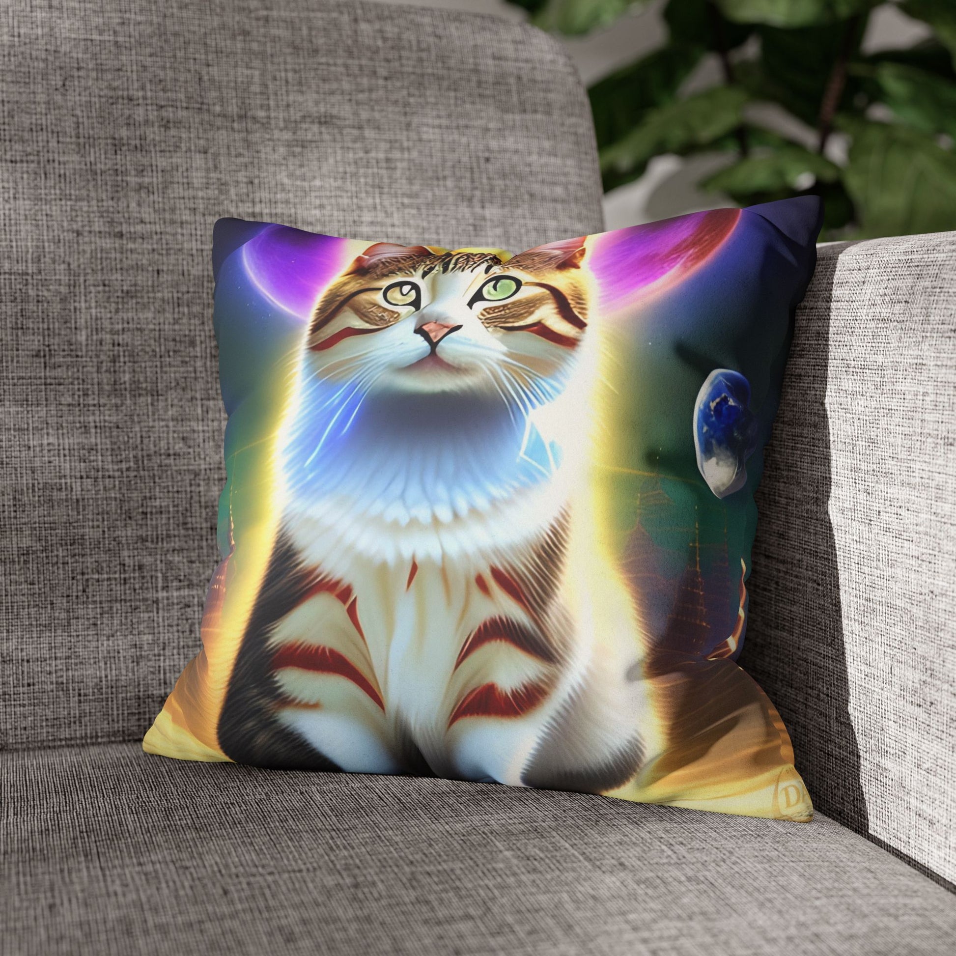 Divine Arts Faux Suede Double-Sided Square Pillow Case - Fantasy Galaxy Space Cat Lover Female Brown and White Tabby Cat with Heterochromia and a Bright Yellow & Purple Aura Spiritual Pillow Cover in Four Sizes
