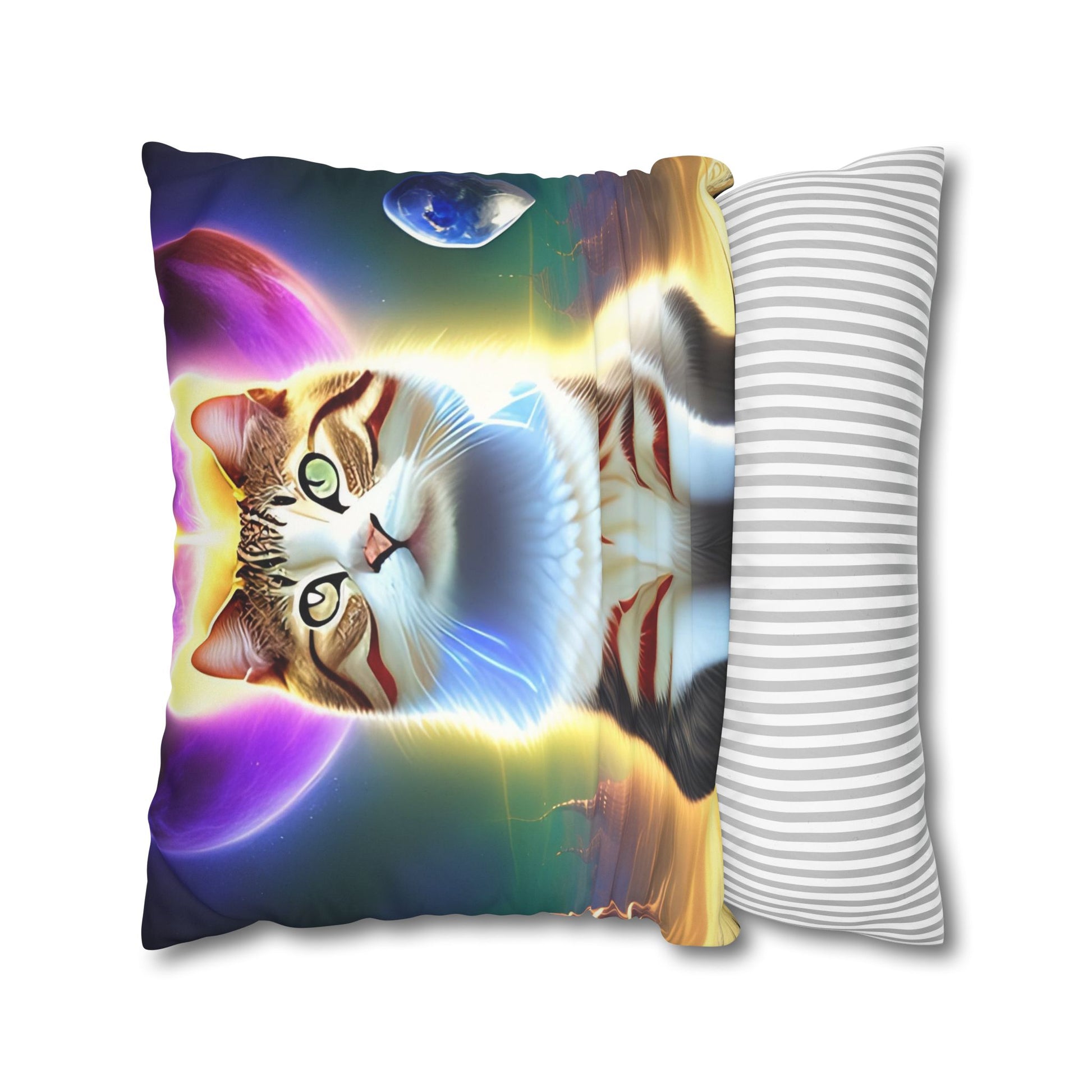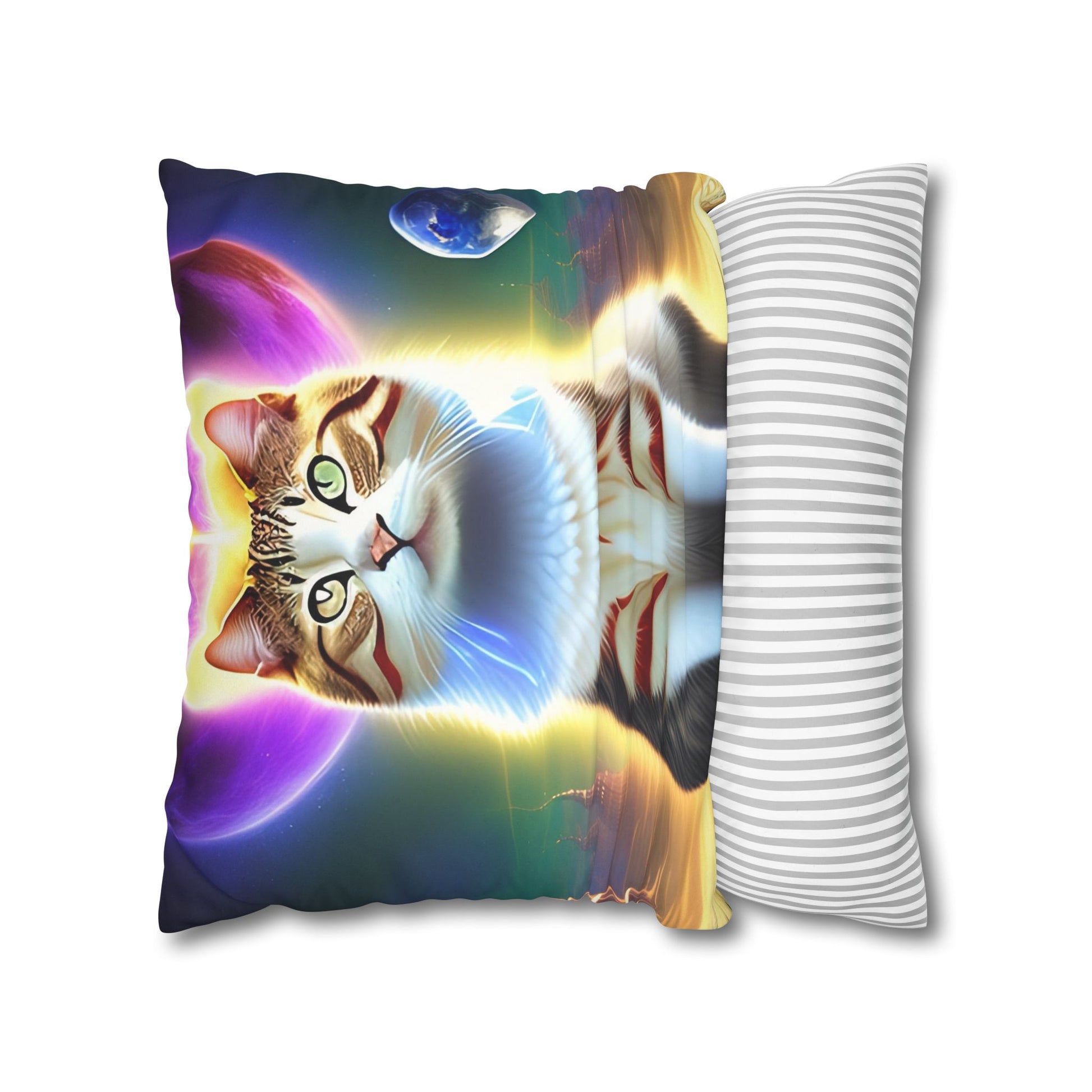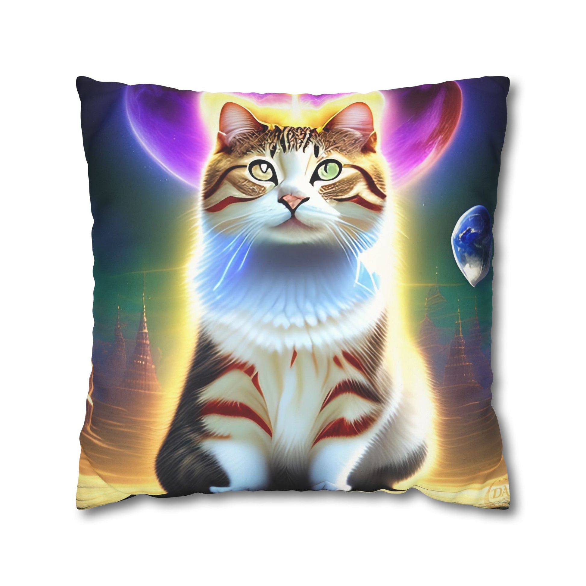 Divine Arts Faux Suede Double-Sided Square Pillow Case - Fantasy Galaxy Space Cat Lover Female Brown and White Tabby Cat with Heterochromia and a Bright Yellow & Purple Aura Spiritual Pillow Cover in Four Sizes