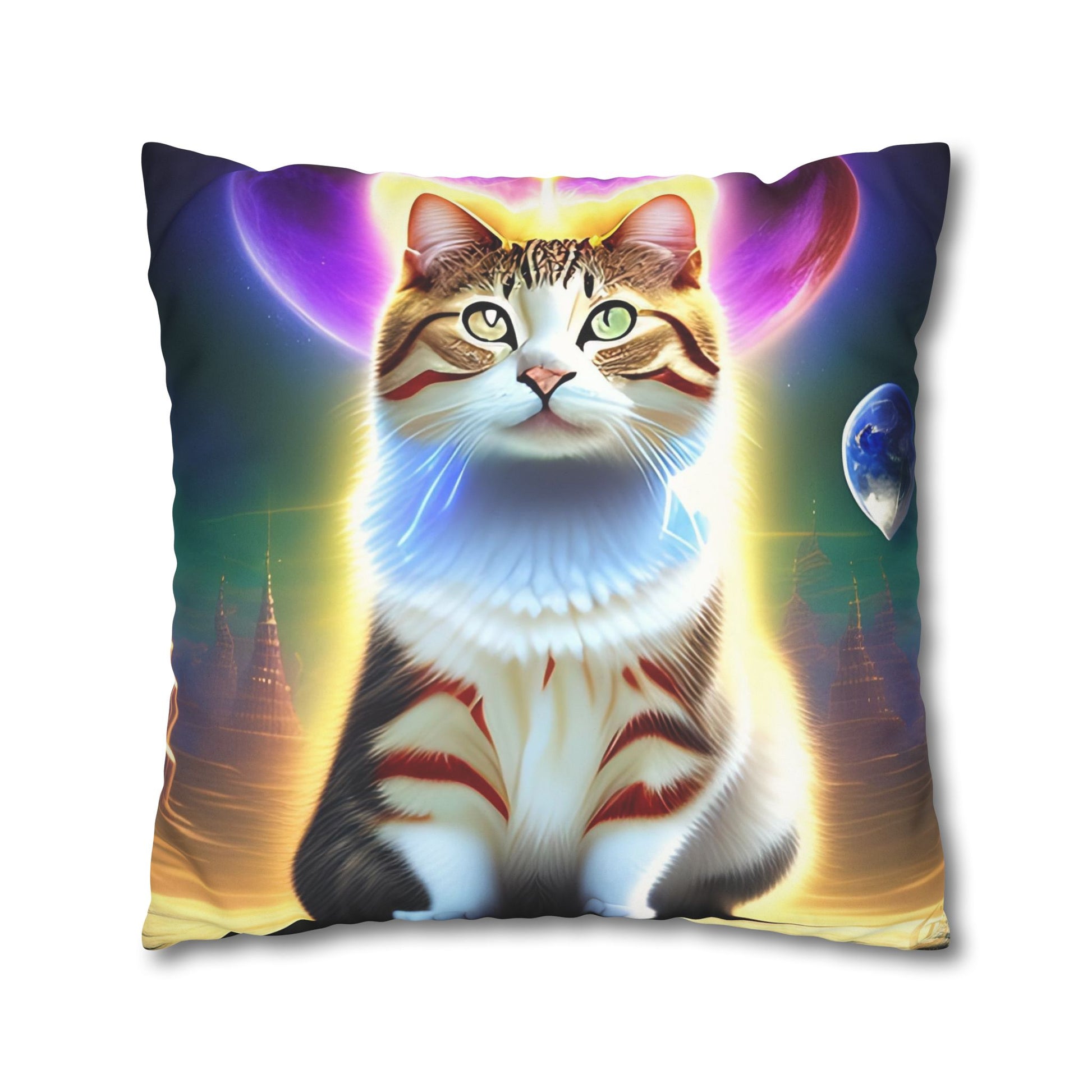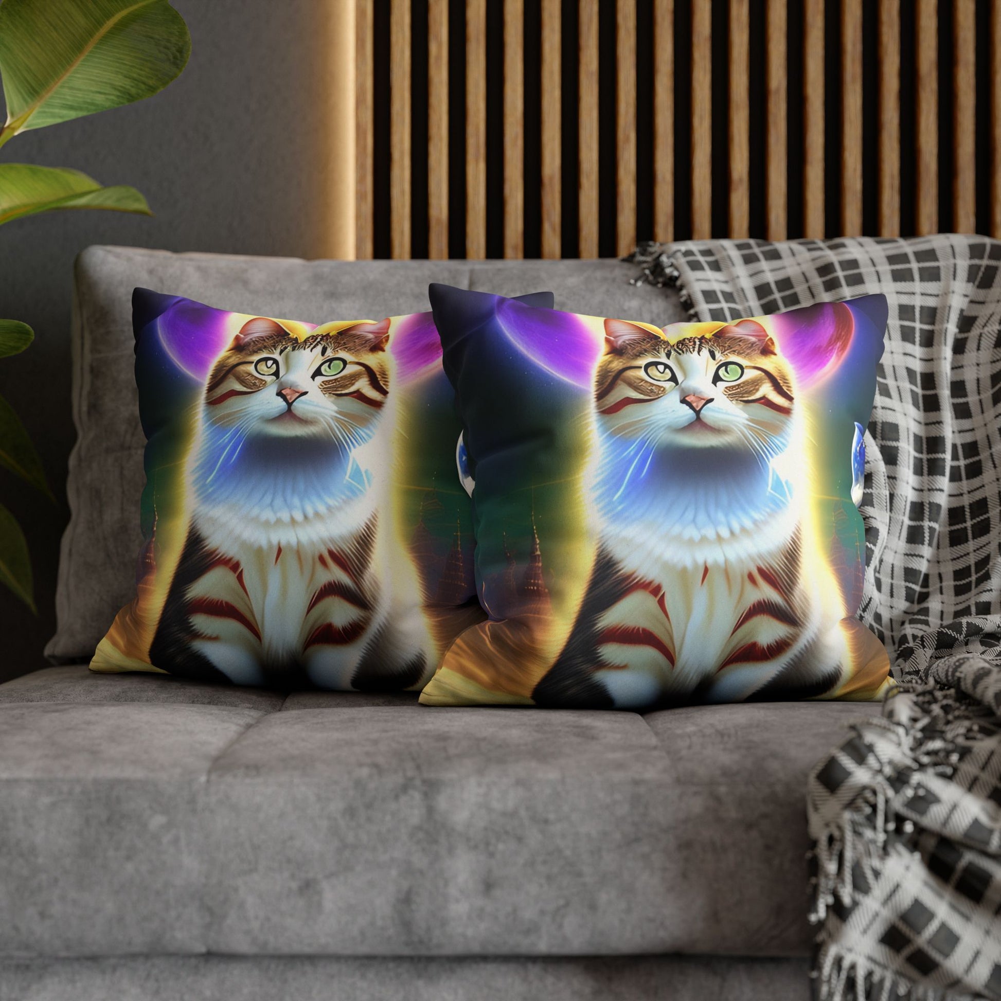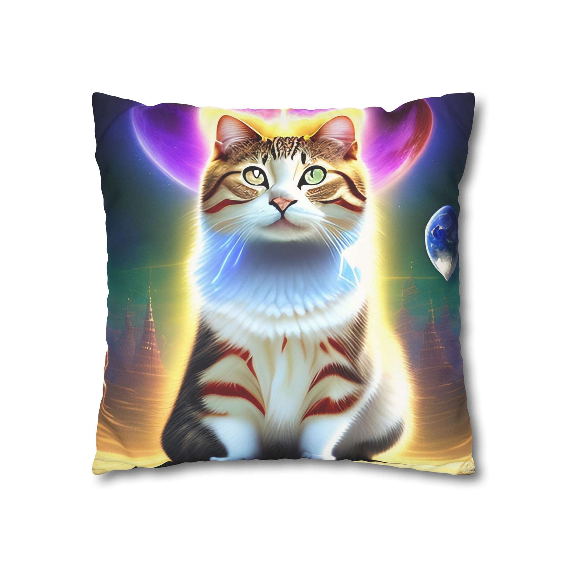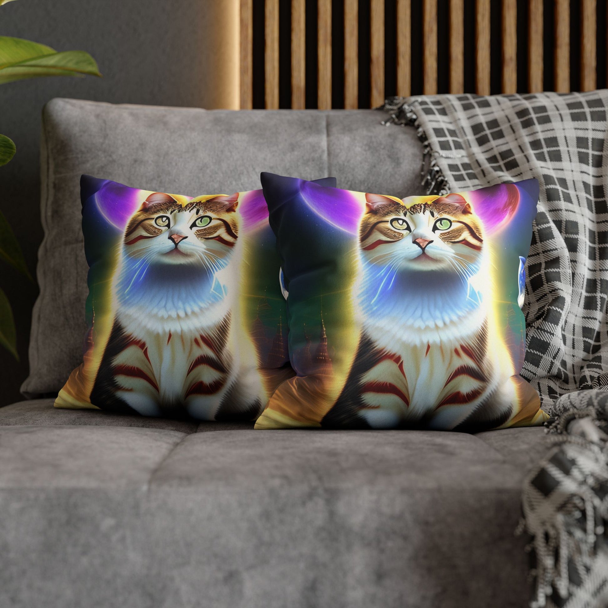 A definite statement piece, this indoor, 100% faux suede, double-sided print pillow cover is avaliable in various sizes and features a vibrant spiritual portrait of a brown female tabby cat with heterochromia (i.e. one yellow eye and one green eye) and a bright yellow and purple aura from weilding the merkaba that represents the light body link to Earth and sentient life energy shields.ย